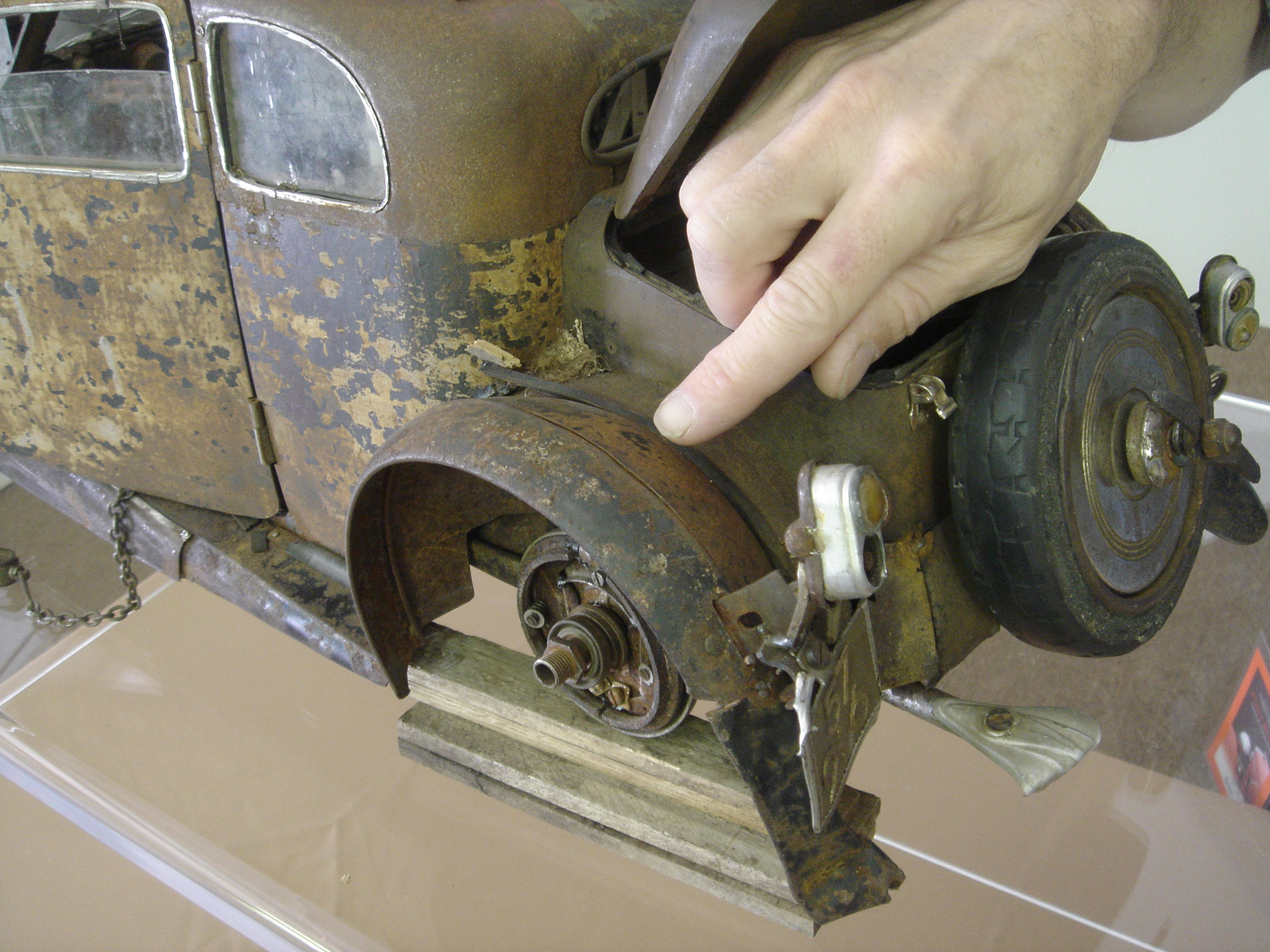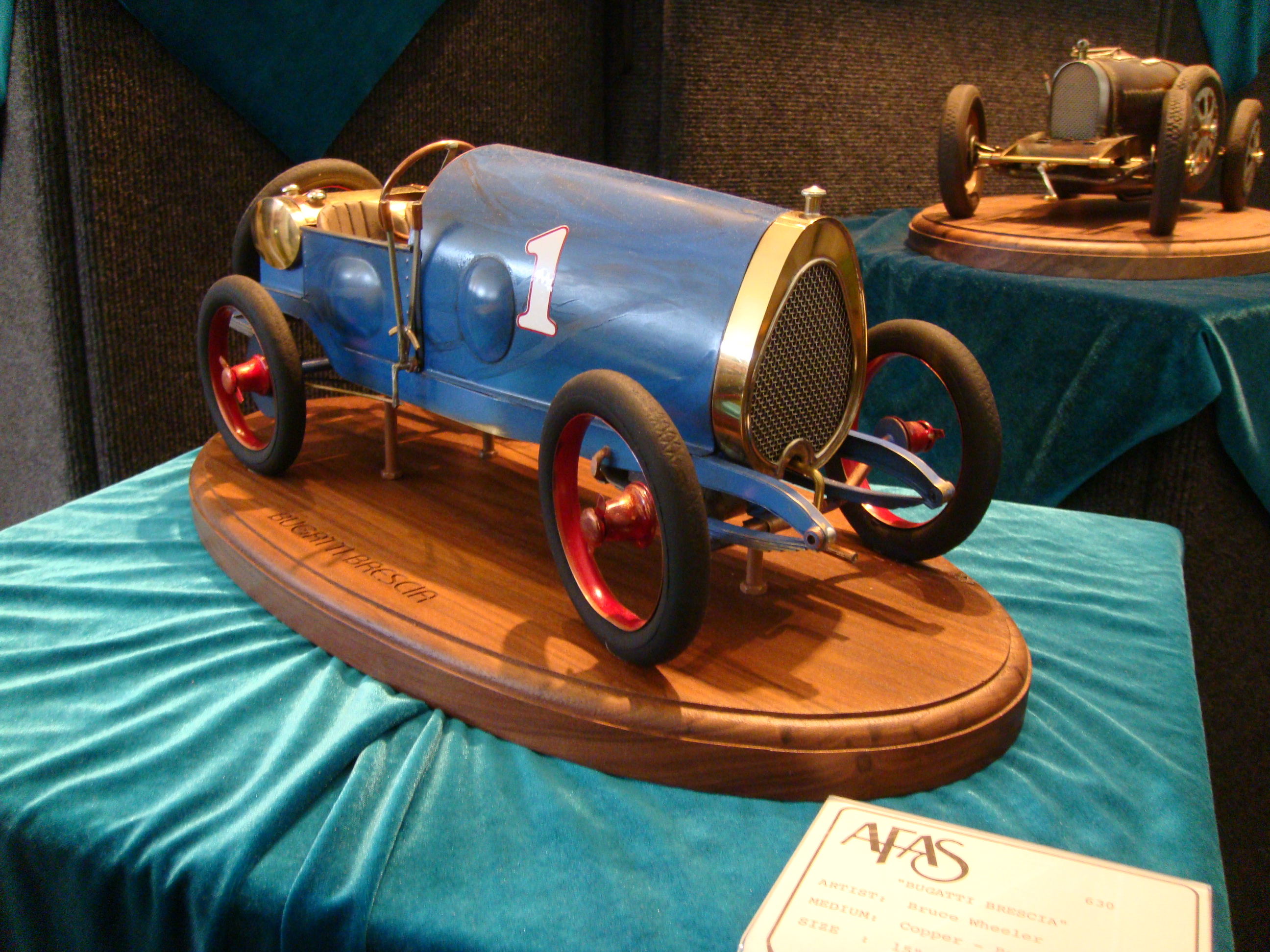 The 1910 Type 13 Brescia was the first real Bugatti automobile. Other Brescia variations, Types 15, 17, 22 and 23, all shared the Type 13’s minimalist engineering and elegant nature. This Brescia by Arizona artist Bruce Wheeler, rendered in copper, brass, rubber and wood, shows the litheness of a Bugatti voiturette, especially noteworthy in that era of 10-liter race cars.