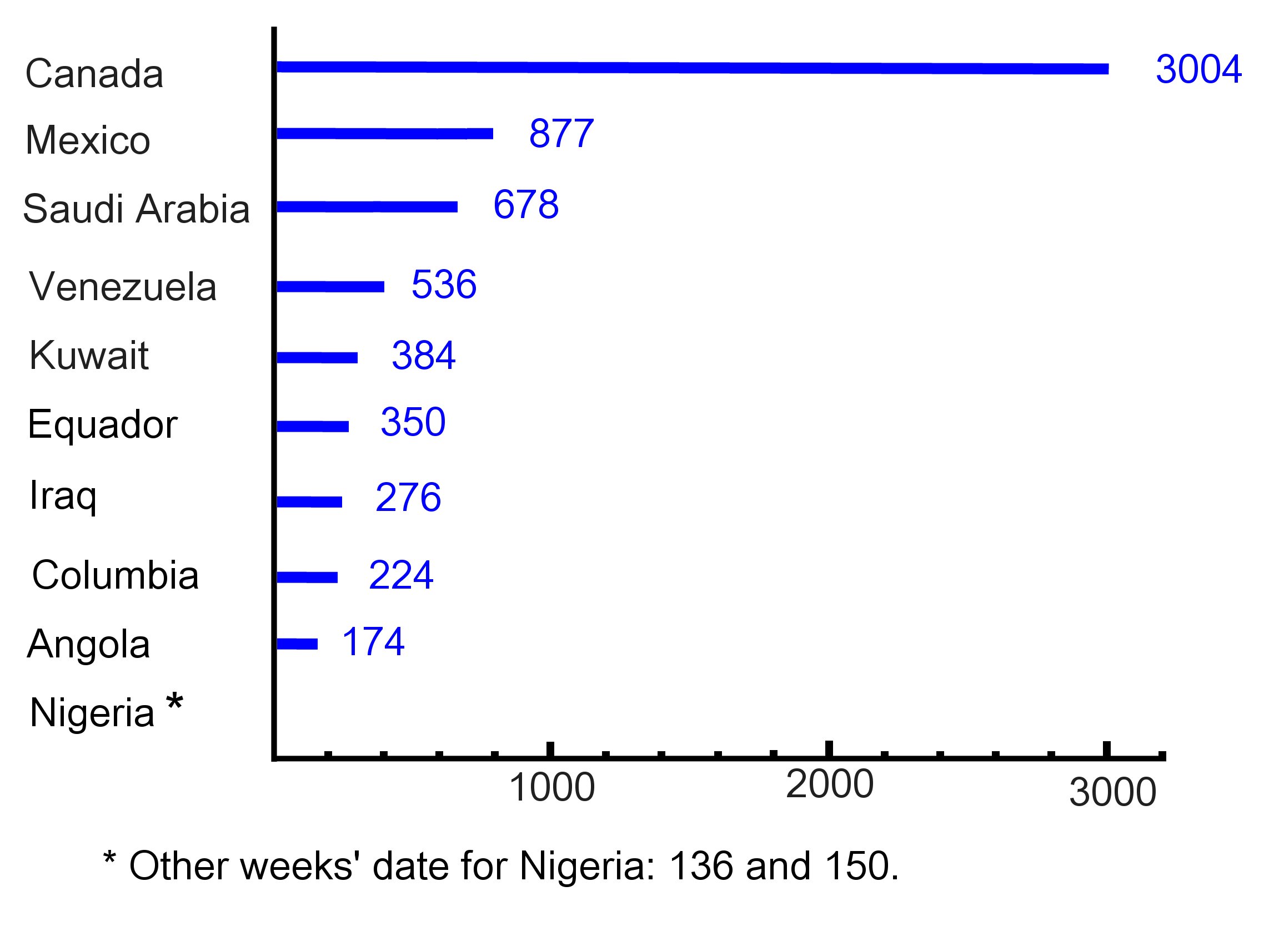 Whence the crude oil imported into the U.S.? Units are thousands of barrels per day. Data for the week of October 24, 2014. Source: U.S. Energy Information Administration (http://goo.gl/rsbHxS).