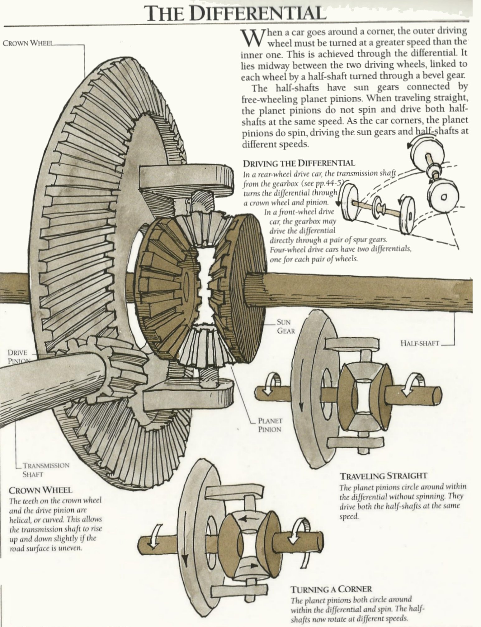 When the car is traveling straight, the planet pinions are driven by the crown wheel without spinning. When the car goes through a corner, the planet pinions spin, driving their sun gears, and corresponding half-shafts, at different speeds.
