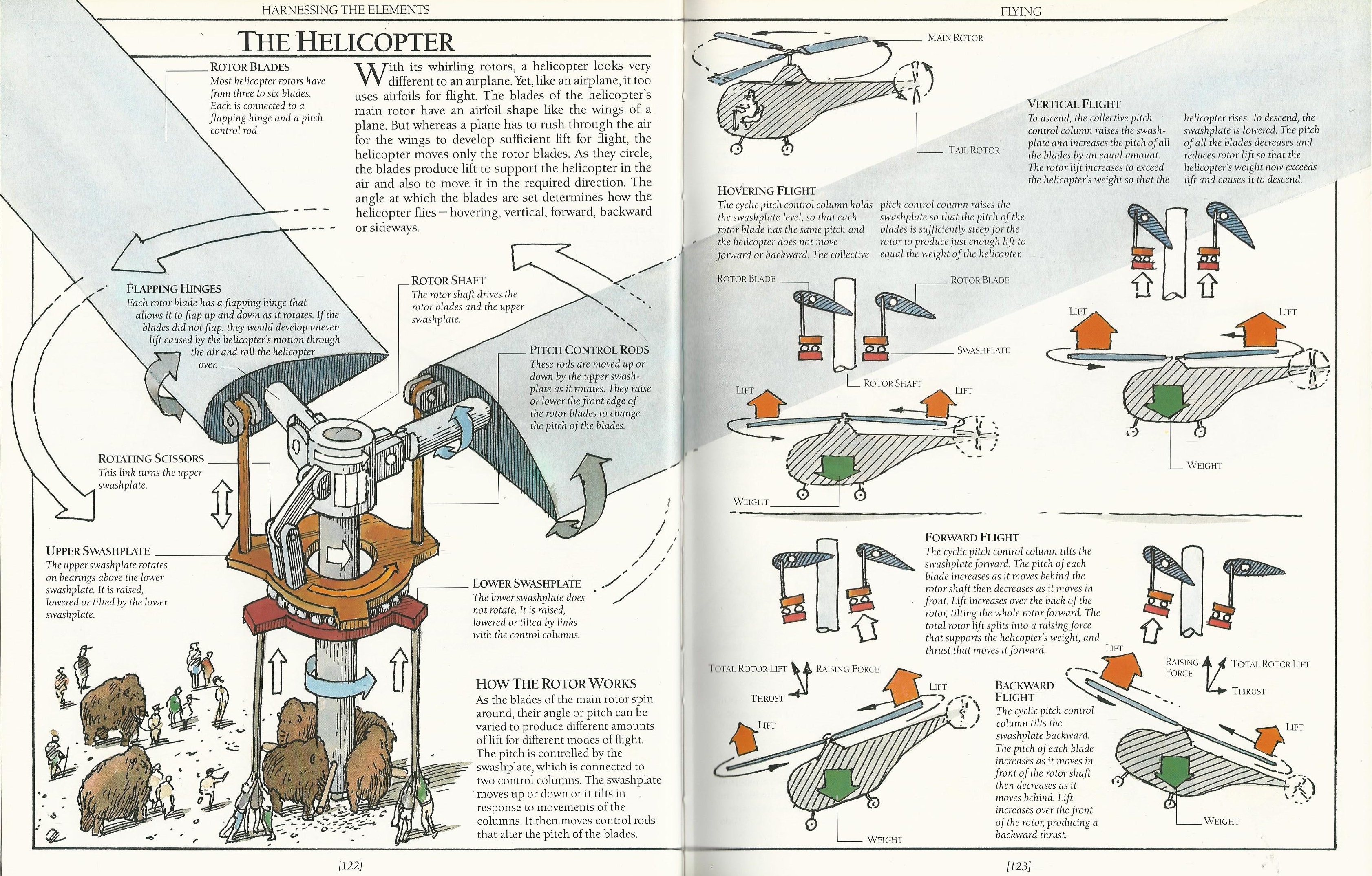 Macaulay’s two-page illustrations of helicopter swashplates, pitch control rods and adjustable hinges accompany this succinct description: “As the blades of the main rotor spin around, their angle or pitch can be varied to produce different amounts of lift for different modes of flight.”