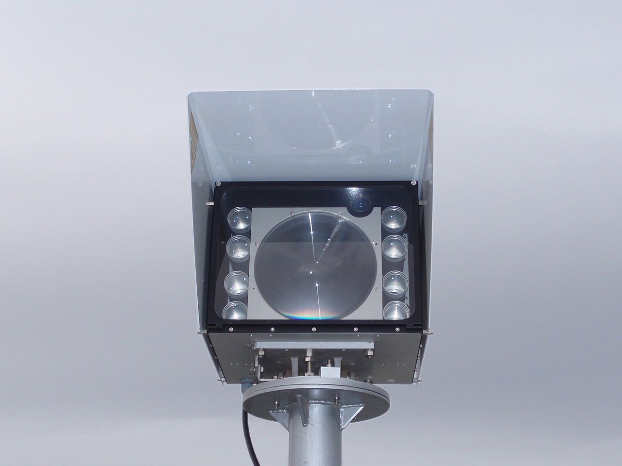A Free-Space Optics laser link. The receptor is the large disc; transmitters surround it. Image by Adamantios.