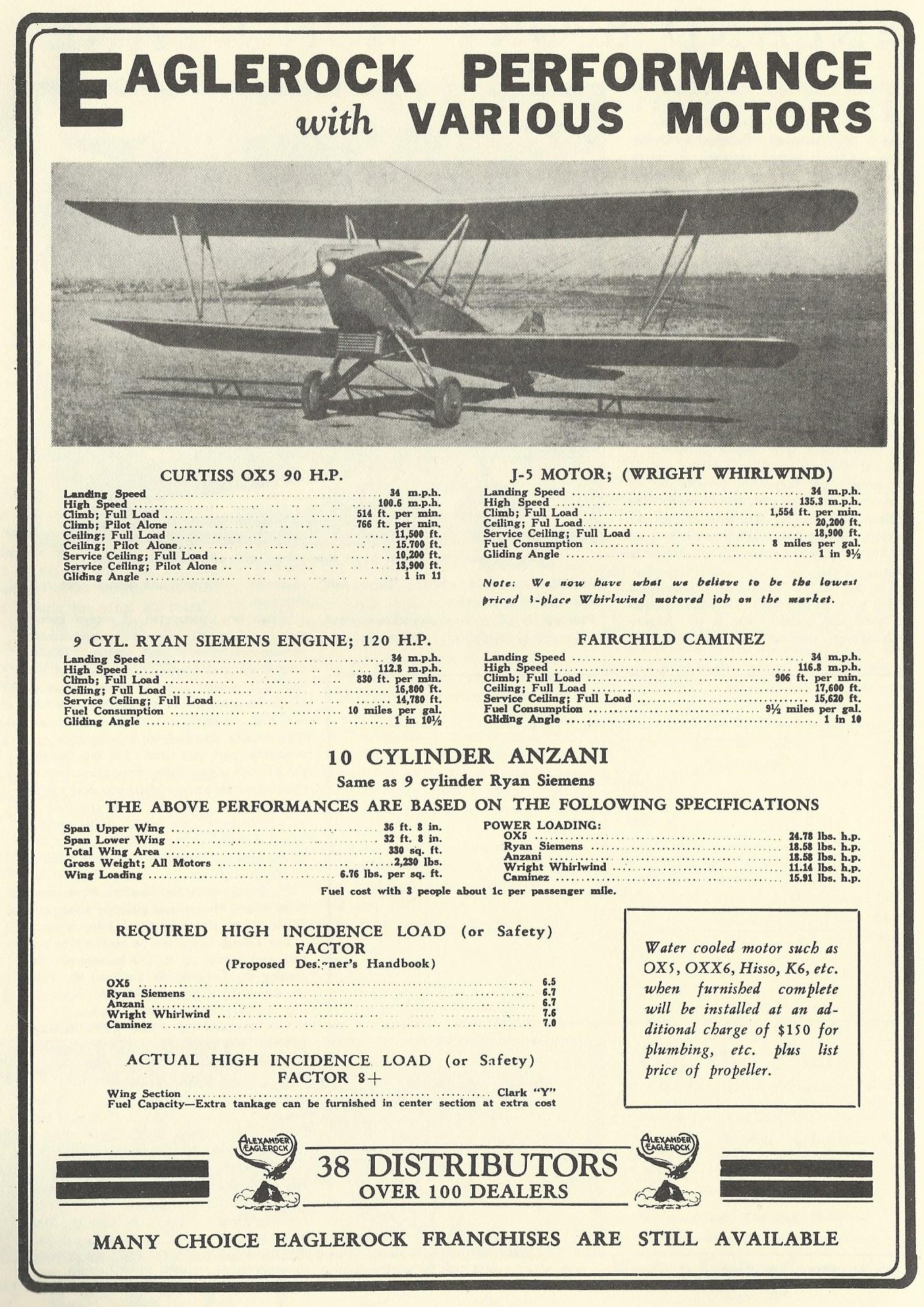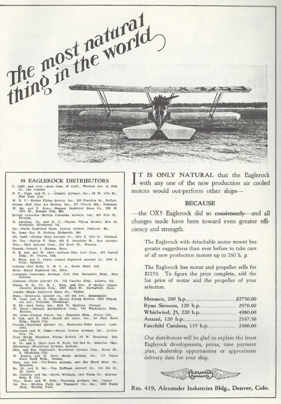 Eaglerocks were originally powered by the Curtiss OX-5 (http://wp.me/p2ETap-rz). When its war-surplus supply dwindled, Alexander offered the customer an Eaglerock, sans engine and propeller, for $2250. Add the price of power, ranging from a $2167 130-hp Anzani to a $4980 220-hp Wright Whirlwind J5.