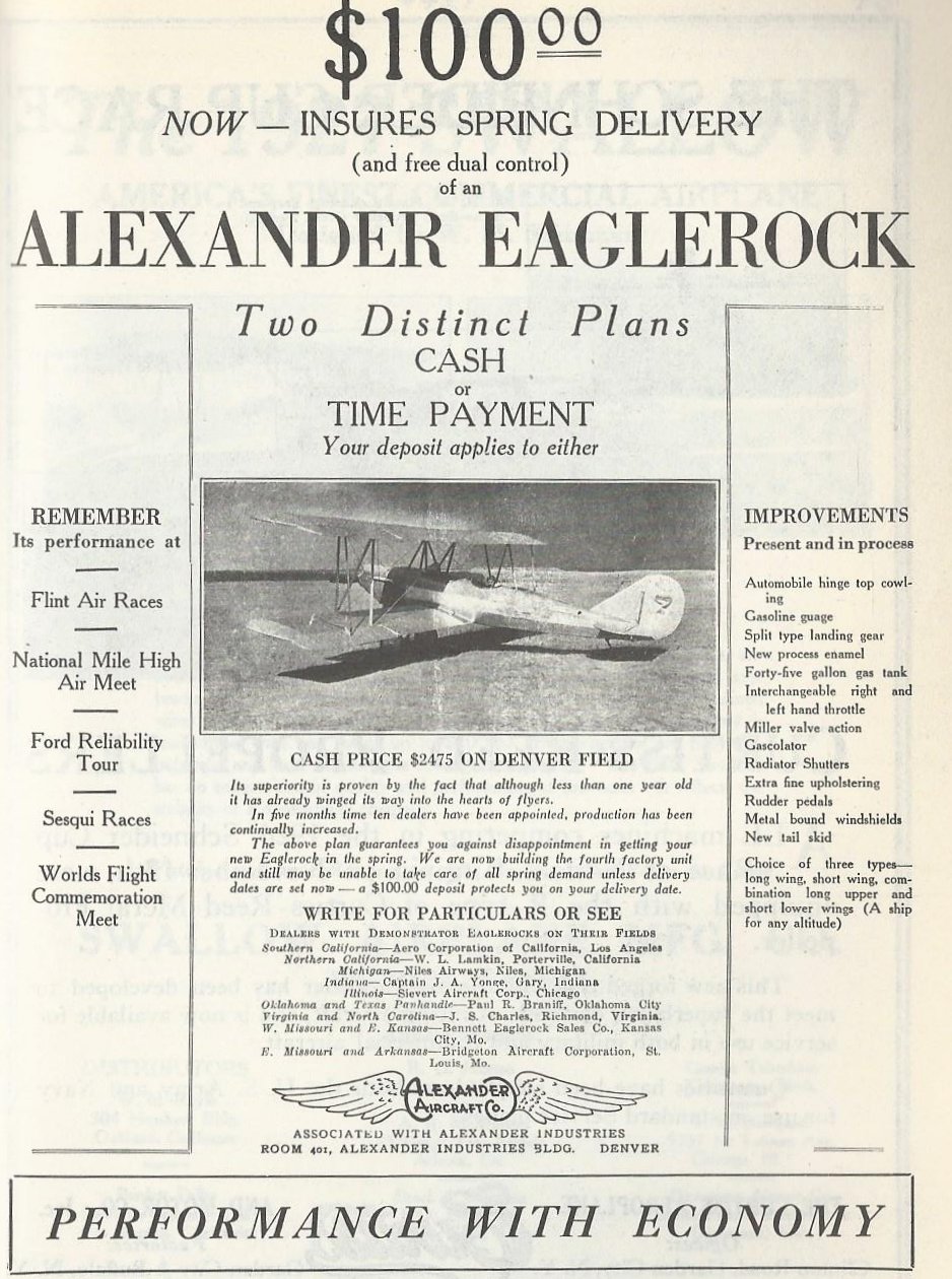 Another Alexander innovation was offering the Eaglerock on a time payment plan. Its cash price in 1926, delivered at Denver Field, was $2475, considerably more than the cost of a war-surplus Curtiss JN-4 Jenny (http://wp.me/p2ETap-J3).