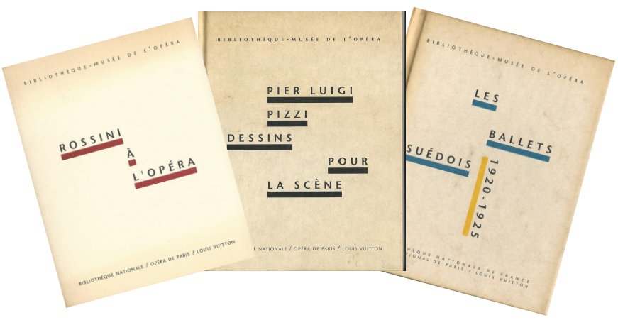 Three mini art books, each from the Bibliotèque-Musée de l’Opera series. Rossini À L’Opera, 1992; Pier Luigi Pizzi Dessins Pour La Scène, 1992; and Les Ballets Suédois 1920 – 1925, 1994; in French, published jointly by the Bibliothèque National de France, Opéra National de Paris and Louis Vuitton.