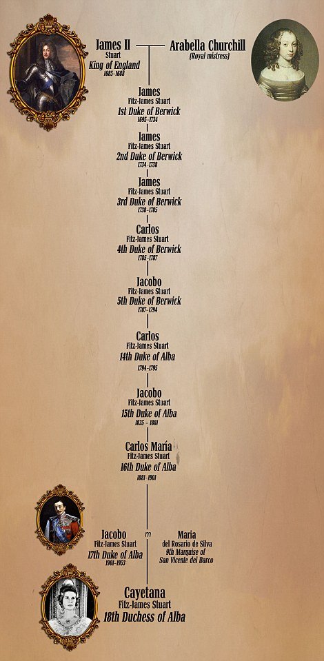 The Duchess’s ancestors include King James II of England (reigning 1685 – 1688) and his mistress Arabella Churchill (distant kin of Winston Churchill and of Diana, Princess of Wales).