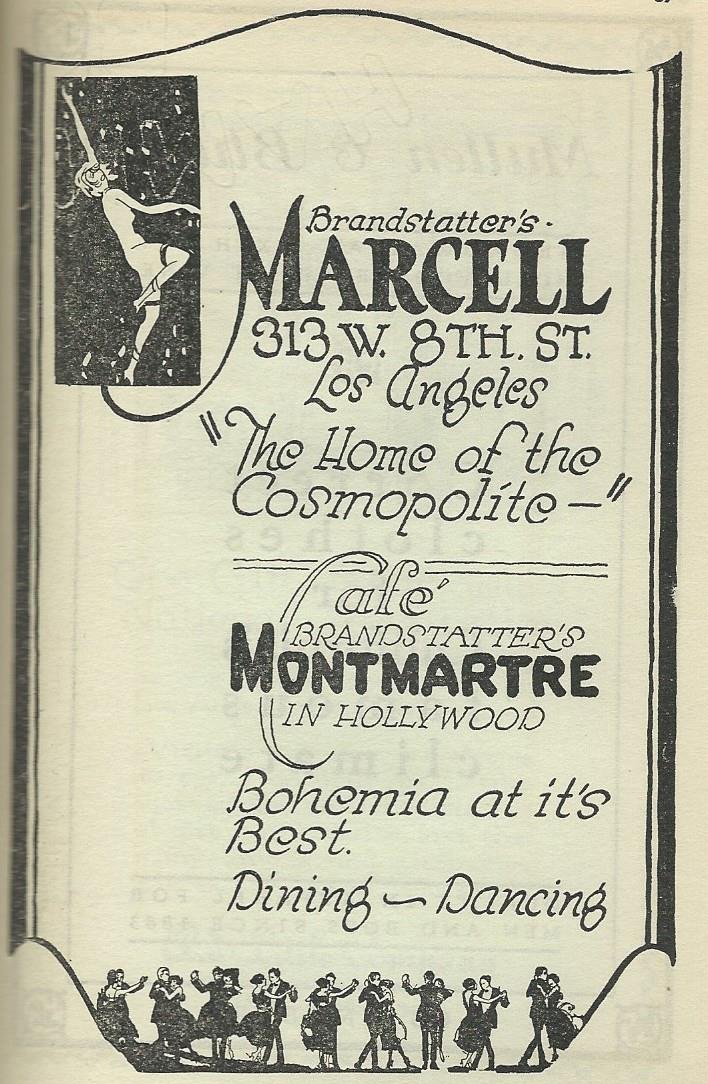 I confess I never visited Brandstatter’s Café Montmartre, “Bohemia at it’s [sic] best.” Adolph “Eddie” Brandstatter’s Los Angeles hot spots in the 1920s and 1930s included this place as well as Sardi’s.