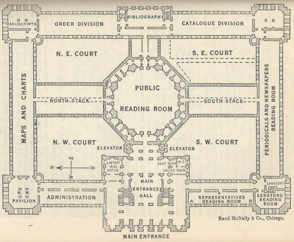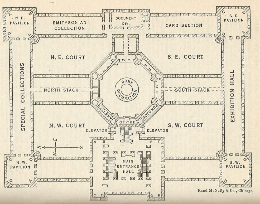 Plans for the Library of Congress, second floor above, first floor below. Images from Rider’s Washington.