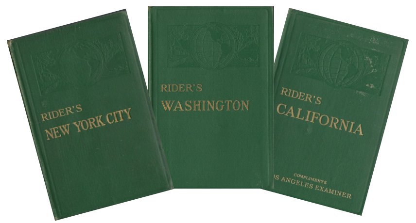Rider’s New York city and vicinity, including Newark, Yorkers and Jersey City: a guide-book for travelers, with 16 maps and 18 plans 1923; Rider’s Washington a Guide Book for Travelers with 3 Maps and 22 Plans 1924; Rider’s California: A guide-book for travelers, with 28 maps and plans, compiled under the general editorship of Fremont Rider by 1925.