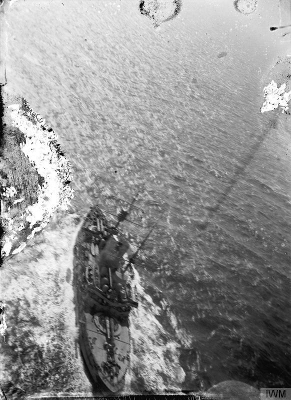 Above, a Cody War Kite in flight. Below, an aerial photograph of HMS Revenge taken from a Cody War Kite in 1908.