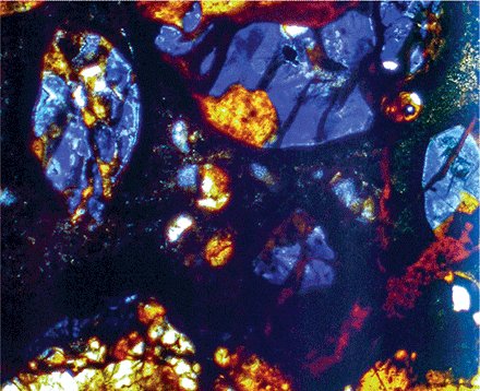 Deep-mantle minerals in a meteorite. The deep blue portions are ringwoodite. Image from Science, November 28, 2014.