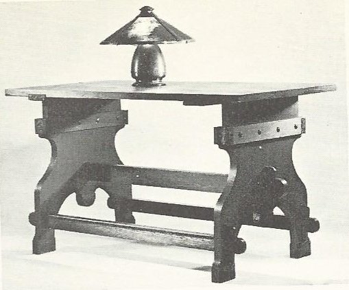 Notes California Design 1910, this library table from the Mission Inn is “presumed to have been built there. With its oversized keys and rakish curves, it is almost a caricature of the sedate designs Gustave Stickley was producing in the east.”