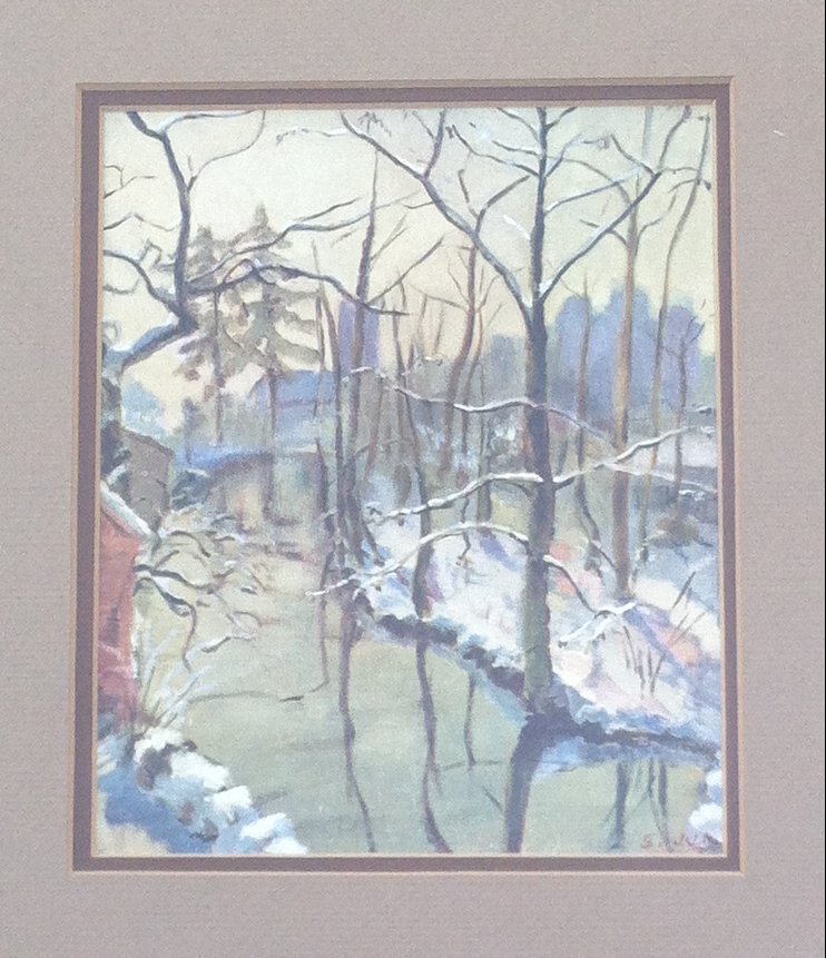 Above, Nunney Castle, Nunney, England, as it appears today. Image from http://www.english-heritage.org.uk. Below, a winter scene at Nunney Court, the castle in the background at right. Painting by Betty Walker.