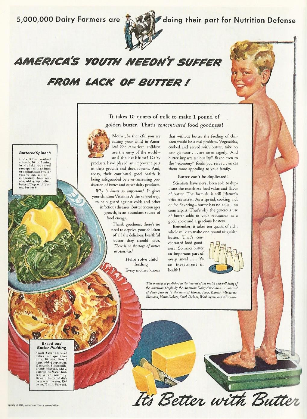 Tempted to try wartime’s oleomargarine? Maybe not after digesting this ad message. The American Dairy Association, 1942.