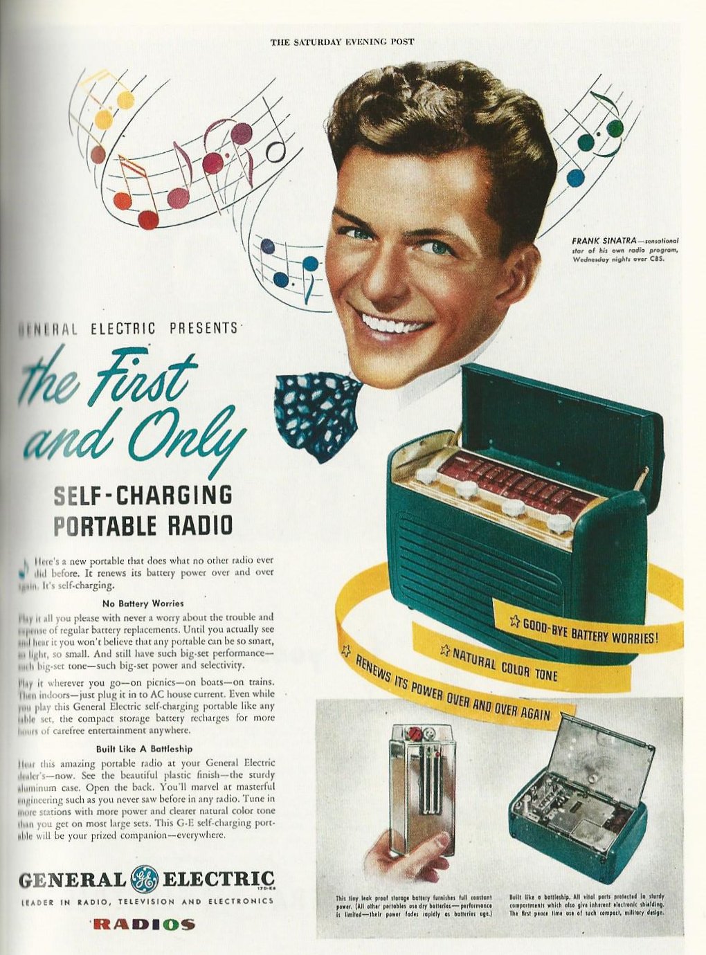 This G.E. portable was the iPod nano of the 40s. Its celebrity singer would one day portray Rocky Fortune. General Electric Radios, 1946.