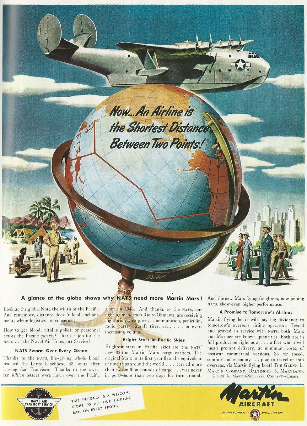 Celebrating the NATS (the Naval Air Transport Service), the Martin Mars seaplane and a post-war promise of world travel. Martin Aircraft, 1945.