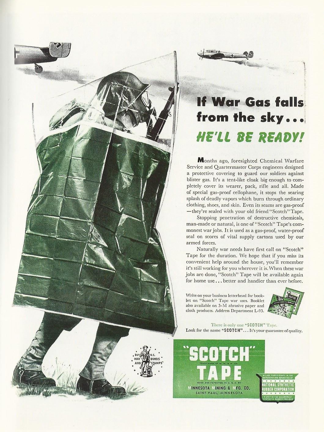 Back when the product carried quote marks, “Scotch,” Minnesota Mining & Mfg envisioned it as having a crucial wartime use. This image, originally appearing in 1943, and others from All-American Ads of the 40s.