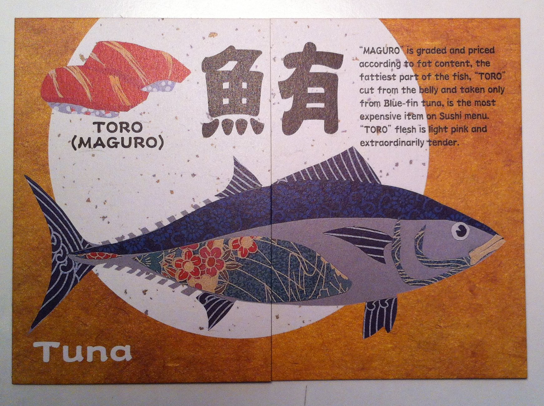 The Maguro Sushi card mentions its grading and pricing according to fat content. Its most expensive variety, toro, comes from the belly of blue-fin tuna, is light pink, extraordinarily tender and melts in the mouth.