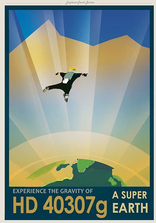 The third in the Exoplanet Travel Bureau’s poster collection is HD 40307g. By intergalactic standards, it’s a relative hop-skip-and-a-jump away, 42 light-years from Earth.