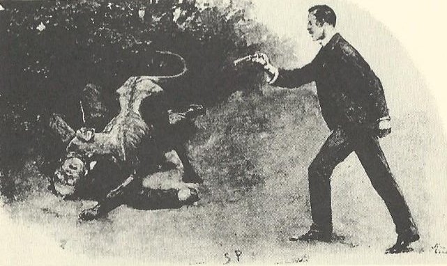 Carlo the mastiff is dispatched by Watson with a single shot in “The Adventure of the Copper Beeches.” Illustration by Sidney Paget for the Strand Magazine, June 1892, from The Annotated Sherlock Holmes.