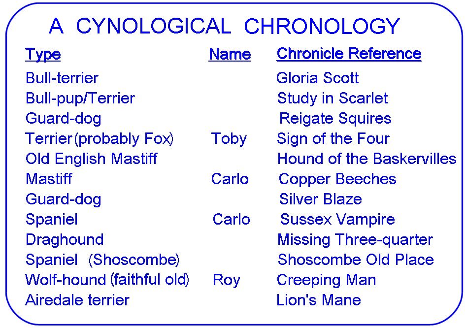 Harrison’s Cynological Mr Holmes cites “a full baker’s dozen of Watson-recorded dogs, with some others of less importance, who may be considered in this Canonical Dog-Show, as having no more than ‘walking-on parts.’ ”