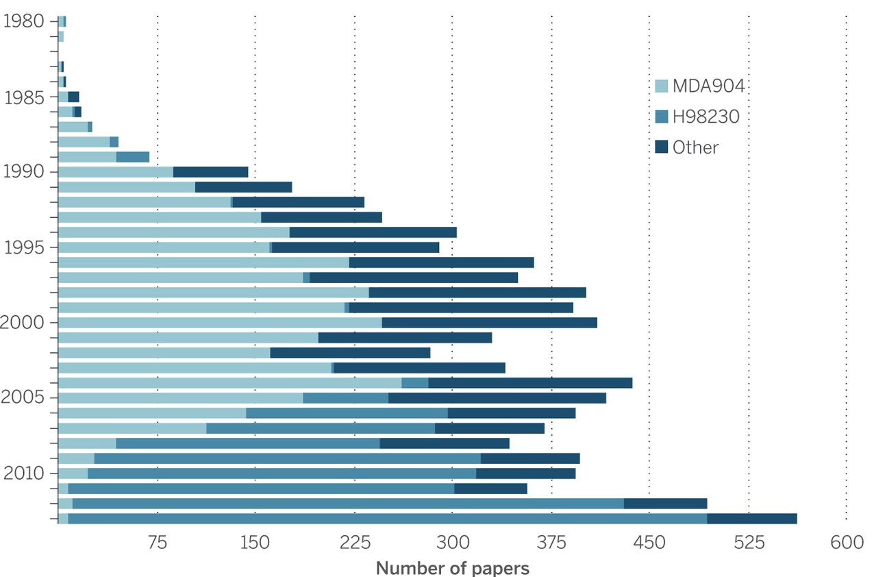 The number of papers acknowledging NSA support grew steadily during the Cold War, peaked at the millennium, then rebounded strongly after 9/11. The two main NSA grant codes are MDA904 and H98230. Image from Science, January 30, 2015.