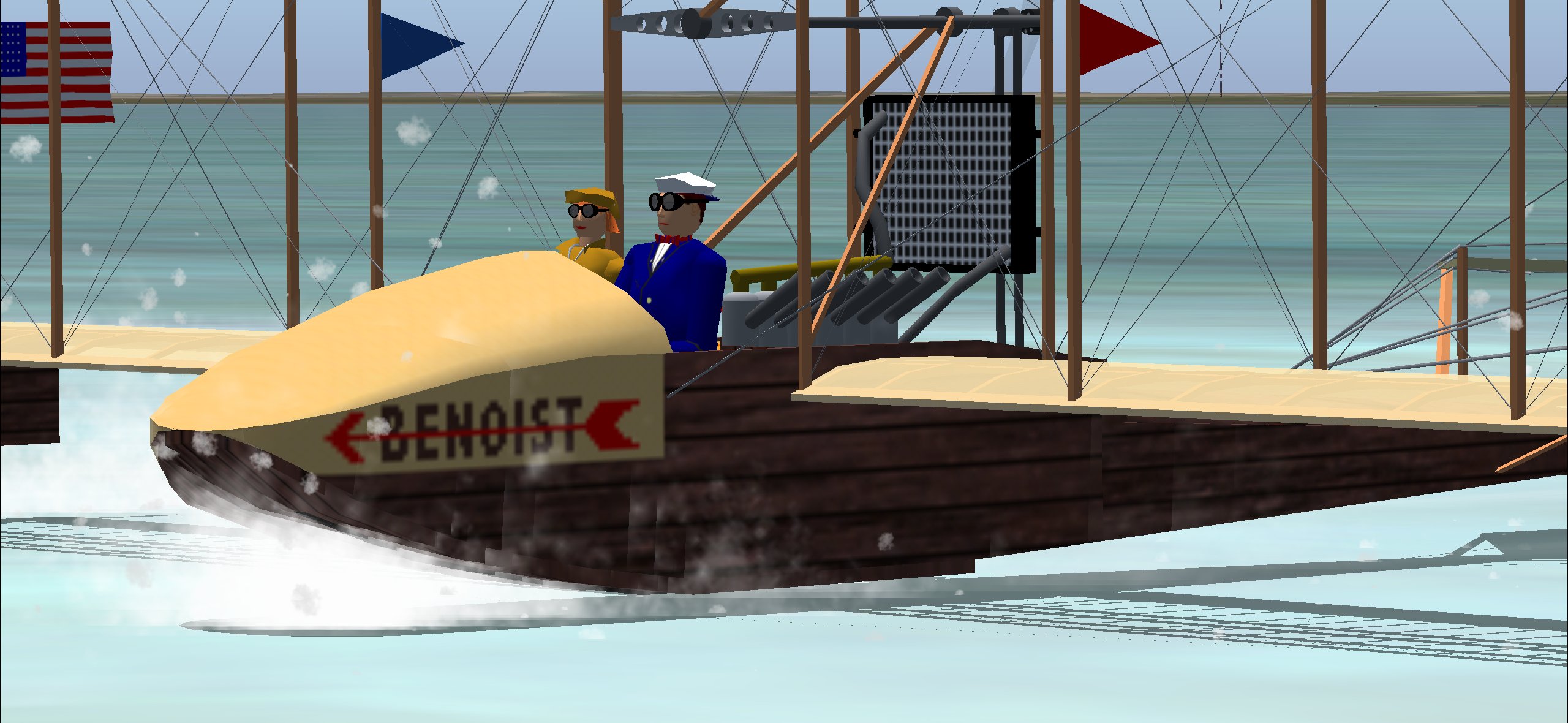 Tony, the redhead with the disturbingly round goggles and the Benoist lift off Tampa Bay. Image from my Microsoft Flight Simulator rendering.