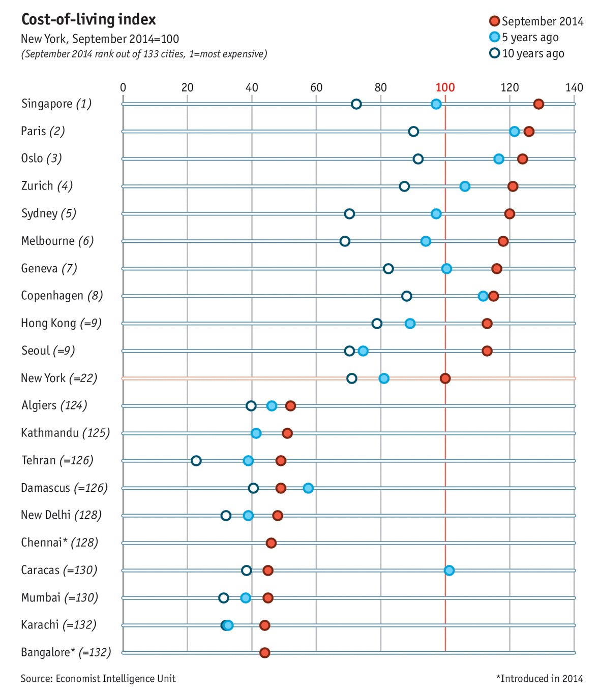 To calculate its Cost-of-living Index, the EIU compares more than 400 prices of 160 products and services. Its survey gathers data from 133 cities in 97 countries.