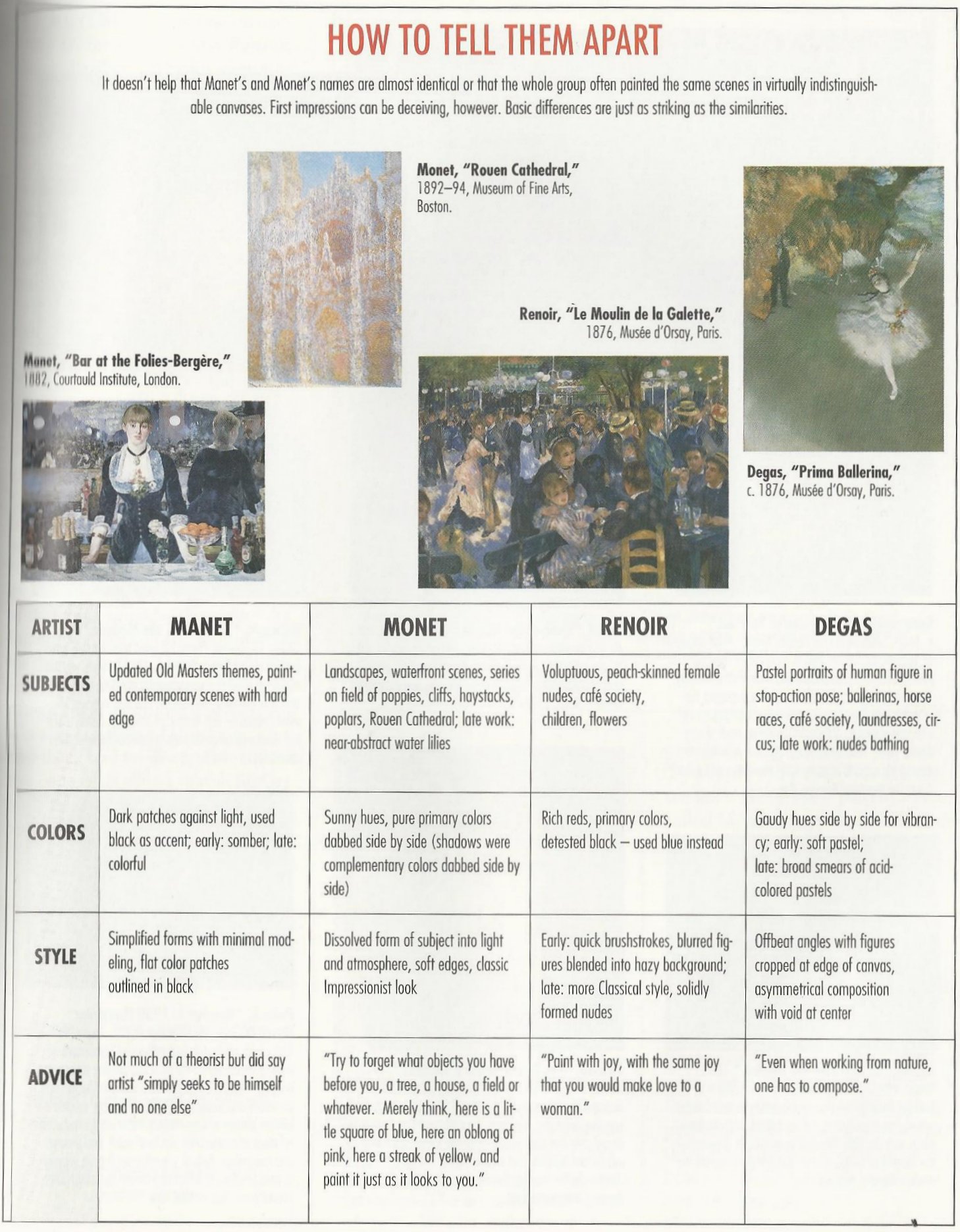 Impressionist artists of the 19th century discovered new means of capturing color and light. In a single page, The Annotated Mona Lisa helps to identify several of Impressionism’s masters, Edouard Manet, Claude Monet, Pierre-Auguste Renoir and Edgar Degas.