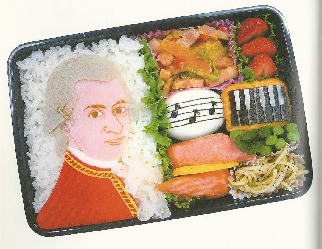 Bento artist Terashima’s Mozart has a face of ham with details of cloud ear. The scarf is another Japanese mushroom, thinly sliced to imply the material’s sheerness.