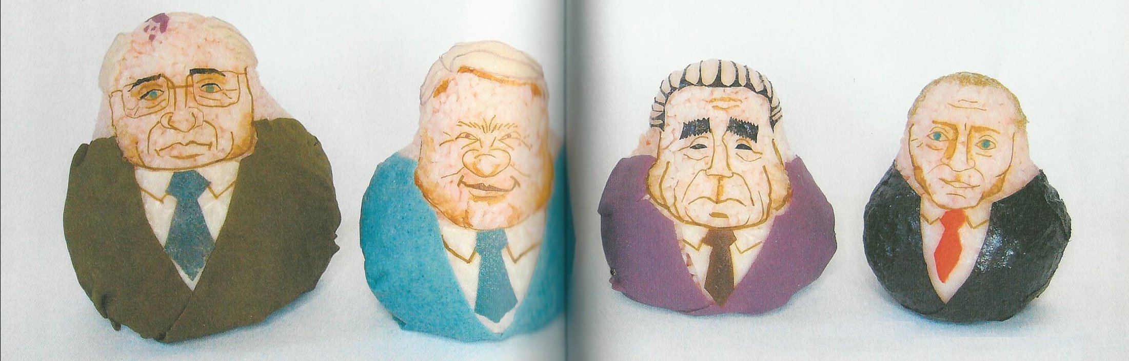 The four separate bento figures titled マトリョーシカ had me puzzled. From left to right, they’re Russian leaders Mikhail Gorbachev, Boris Yeltsin, Leonid Brezhnev and Vladimir Putin. Yet my Nihongo/English was challenged in making sense of ma to ri-yo shi ka.