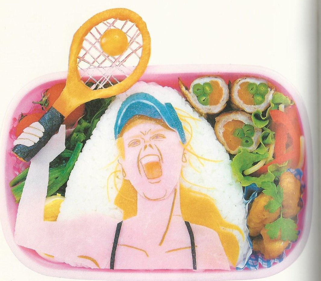 There’s little doubt which international tennis star appears in this bento. The katakana characters シャラポワ translate directly into shi-ya ra po va.