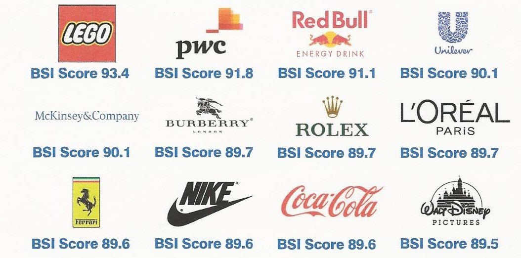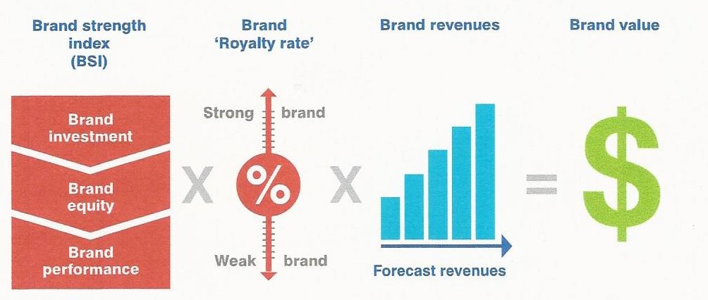 BF calculates Brand Value in a multi-step process. First, its Brand Strength Index is derived from aspects including a brand’s marketing investment, its goodwill and its sustainability. Next, the brand and its competitors are analyzed to get a Royalty Rate for their business segment. (I suspect, for example, the Royalty Rate for pharmaceuticals is high; supermarket chains, low). Also, a brand’s contribution to its company’s revenue, historic and future, is calculated. Last, the product of these three gives its BV, Brand Value.