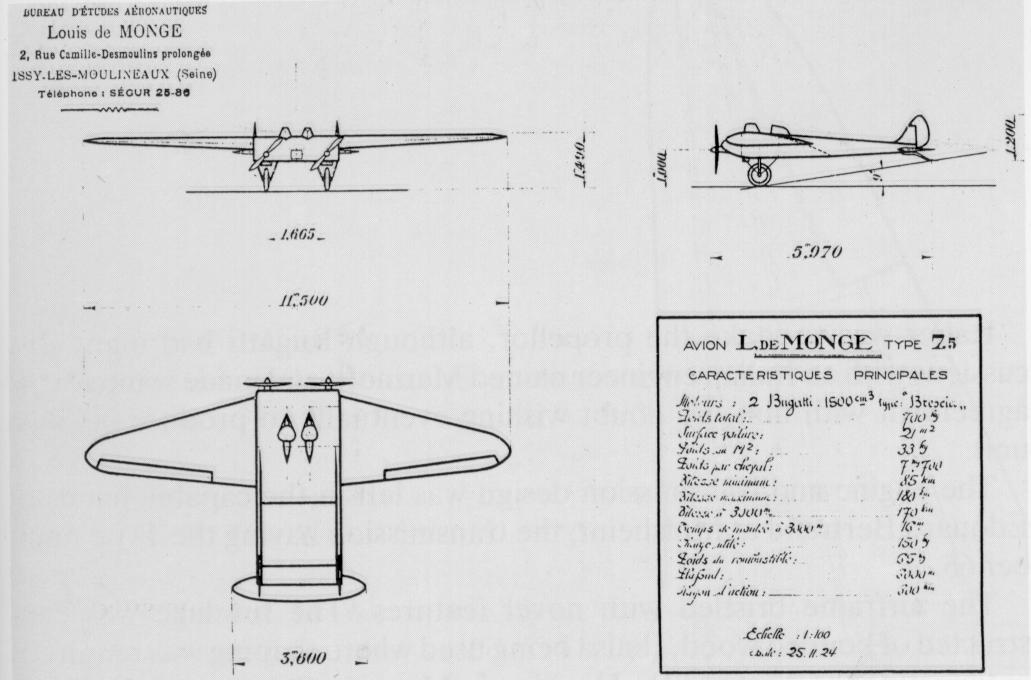 In 1926, De Monge built the Type 7.5, a flying prototype at one-third the size of an envisioned transport. The 7.5 had a wingspan of 38 ft. and a gross weight of 1544 lb. It was powered by two 1500-cc inline-fours used in the Bugatti Brescia sports car.
