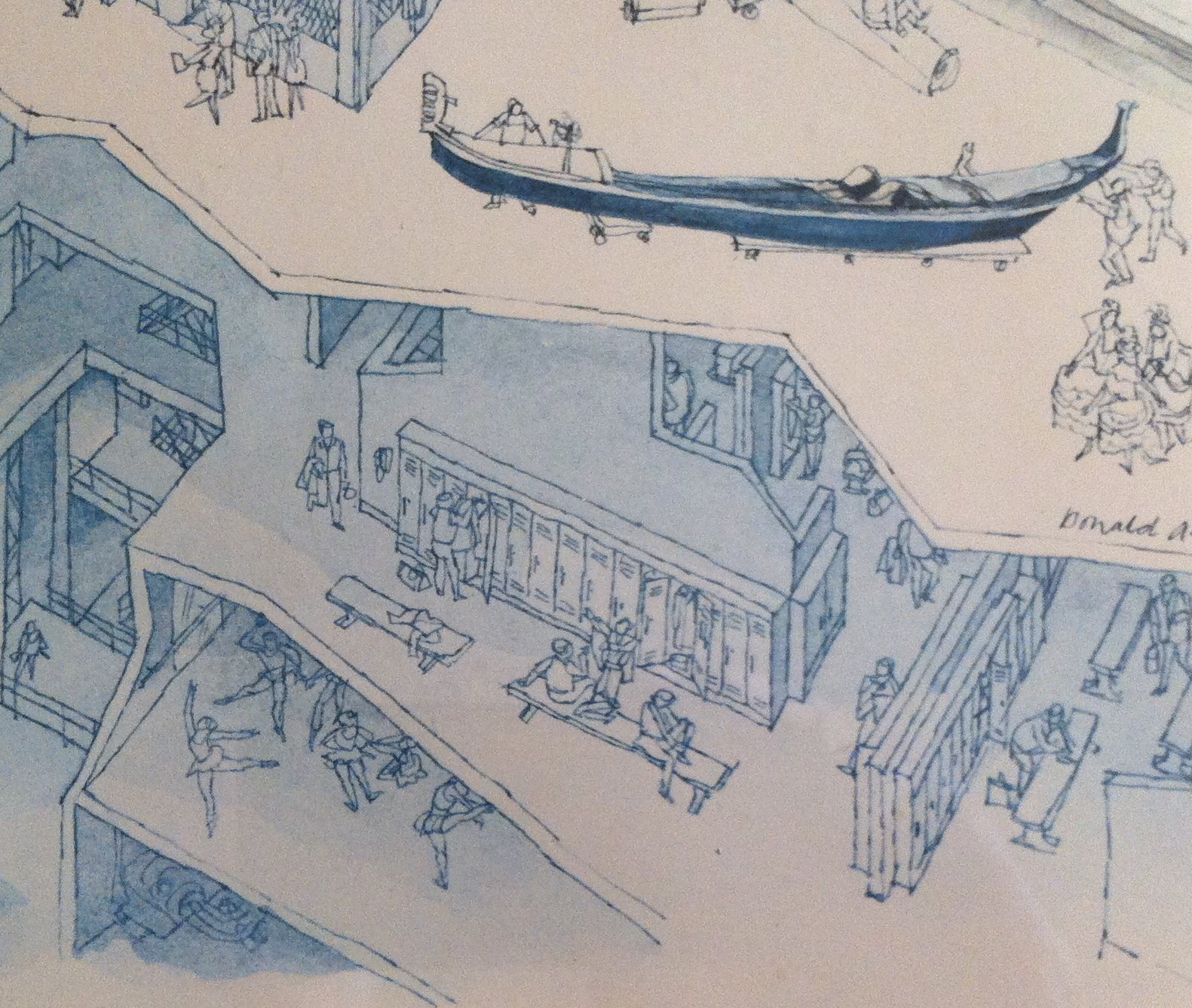 The Met’s stage and wings permit a multiplicity of activities occurring at any one time. This and other images from portions of Mackay’s poster.