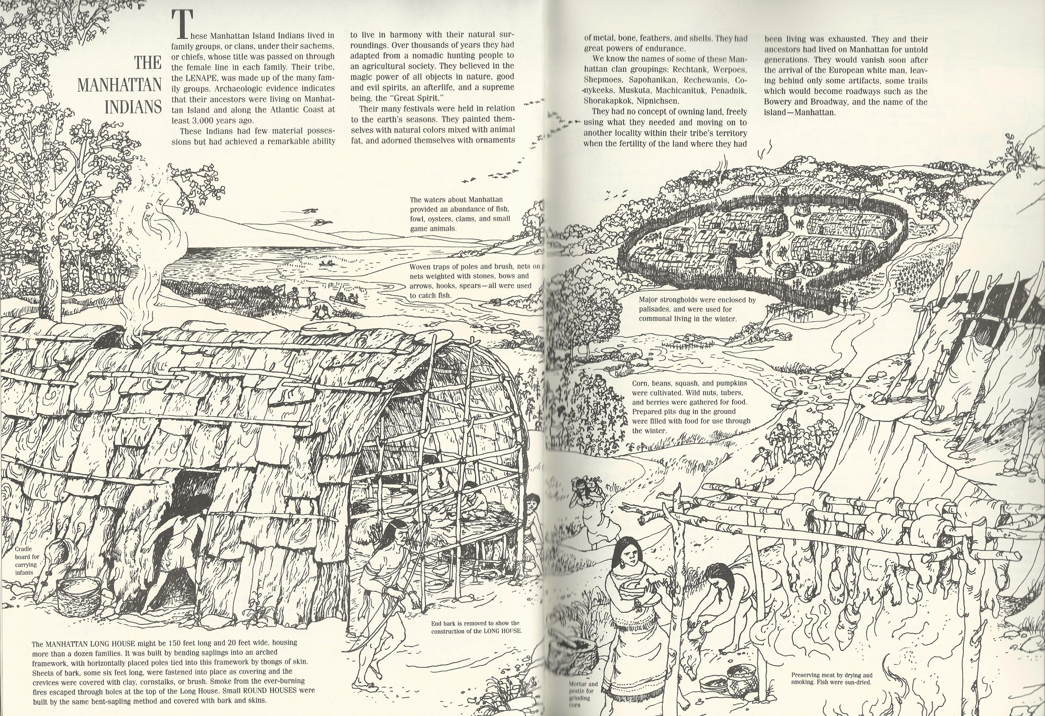 Native Americans of the Lenape nation lived along the Atlantic Coast and on Manhattan Island at least 3000 years ago. This was a matriarchal society which, notes Mackay, “adapted from a nomadic hunting people to an agricultural society. They believed in the magic power of all objects in nature, good and evil spirits, an afterlife, and a supreme being, the ‘Great Spirit.’ ” The word “Manhattan” is said to come from their language, “island of many hills.”