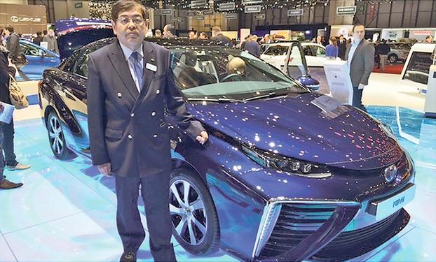 Toyota’s Katsuhiko Hirose and the Mirai FCV. Image from Automotive News, March 9, 2015.