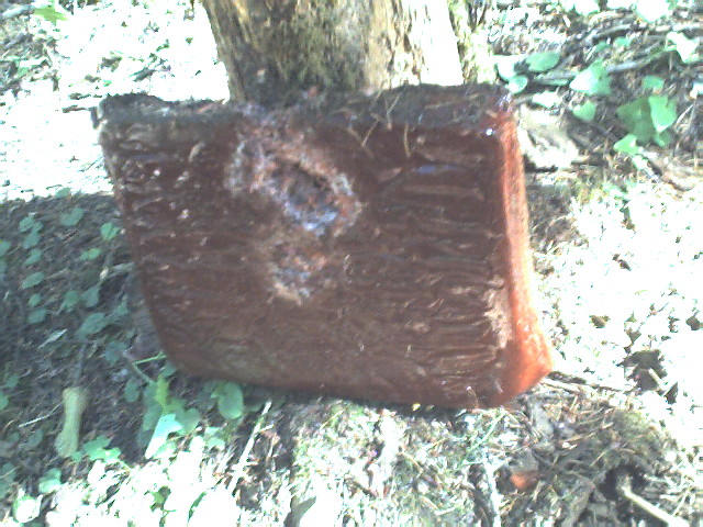 A sample of pykrete, 2 in. thick. The lower mark was caused by a ricocheting round of a 7.62 x 39 mm rifle fired at 15 ft. The upper penetration required seven more rounds. Image from CyranoDeWikipedia.