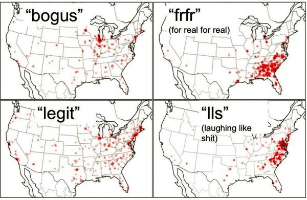 The terms bogus and legit appear to be citified. By contrast frfr (for real, for real) is widespread throughout the Deep South. And researchers observe, without explanation, the clustering of lls (laughing like sh*t) around Maryland.
