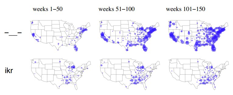 Terms may begin locally, then spread uniformly. For example, the emoticon -_- appeared in the researchers’ 2009 data predominately around a few cities. By 2012, its usage had spread considerably.