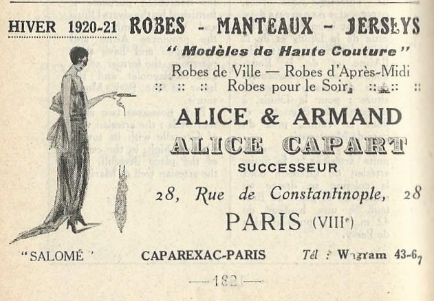 By contrast, Alice & Armand/Alice Capart put a bob-haired flapper in its ad and promised high fashion for the day, afternoon or evening.