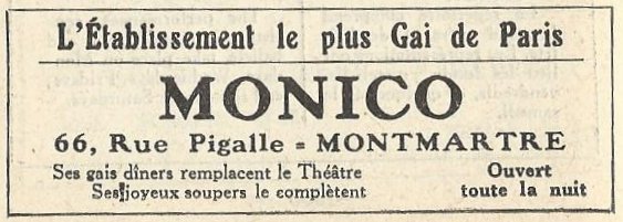 And, were nightlife in mind, what better place to hang out than 66, rue Pigalle; Montmarte. The Monico is le plus Gai de Paris and Ouvert touts la nuit.