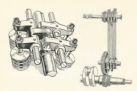 Bentley 6 1/2 Litre valve configuration, four valves per cylinder, its single overhead camshaft driven by a pair of mini crankshafts, 1926. Image from Classic Cars in Profile 1-24