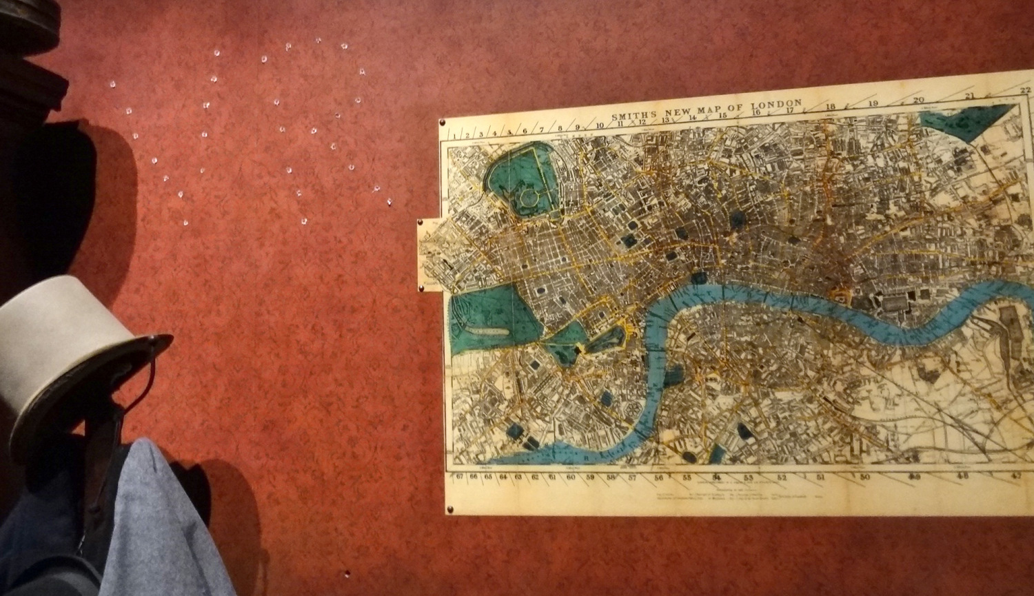 Revolver practice against the wall of 221B Baker Street. Image from the International Exhibition of Sherlock Homes, the Oregon Museum of Science and Industry; photo by Jonathan H. Liu.