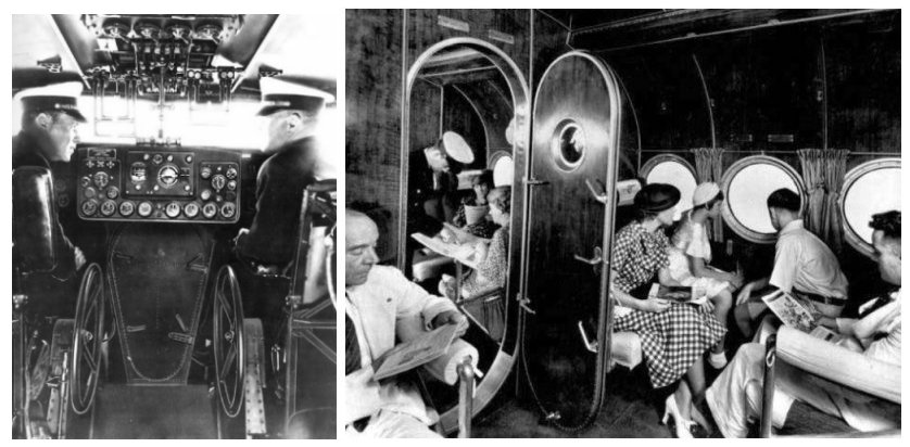 The flight deck and a passenger cabin of the Sikorsky S-42. Images from The Flying Boat Forum.