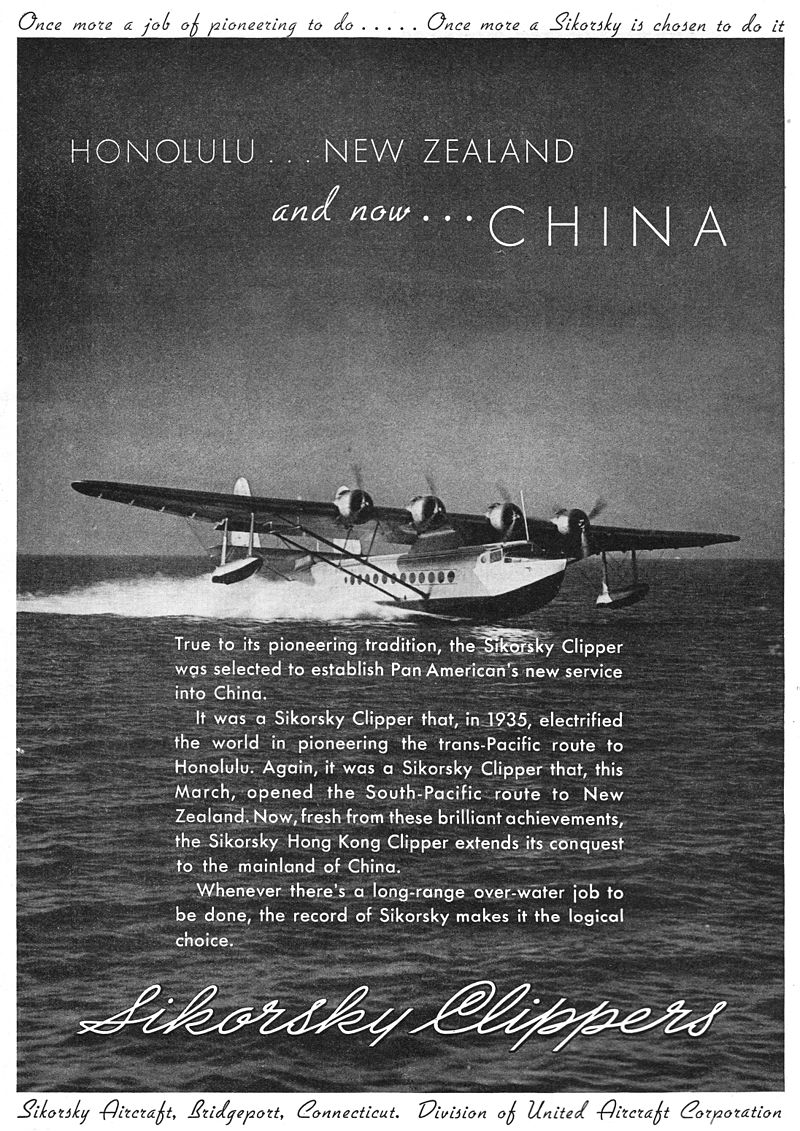 [Note: The following paragraph was corrected May 16, 2015, 10:25 a.m. Pacific time. Though a Sikorsky S-42 was used for Pan Am’s transpacific survey, it was not used on the airline’s inaugural service across the Pacific.]