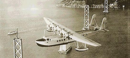 The S-42 Pan Am Clipper II passes over a work in progress, the San Francisco/Oakland Bay Bridge, 1935.