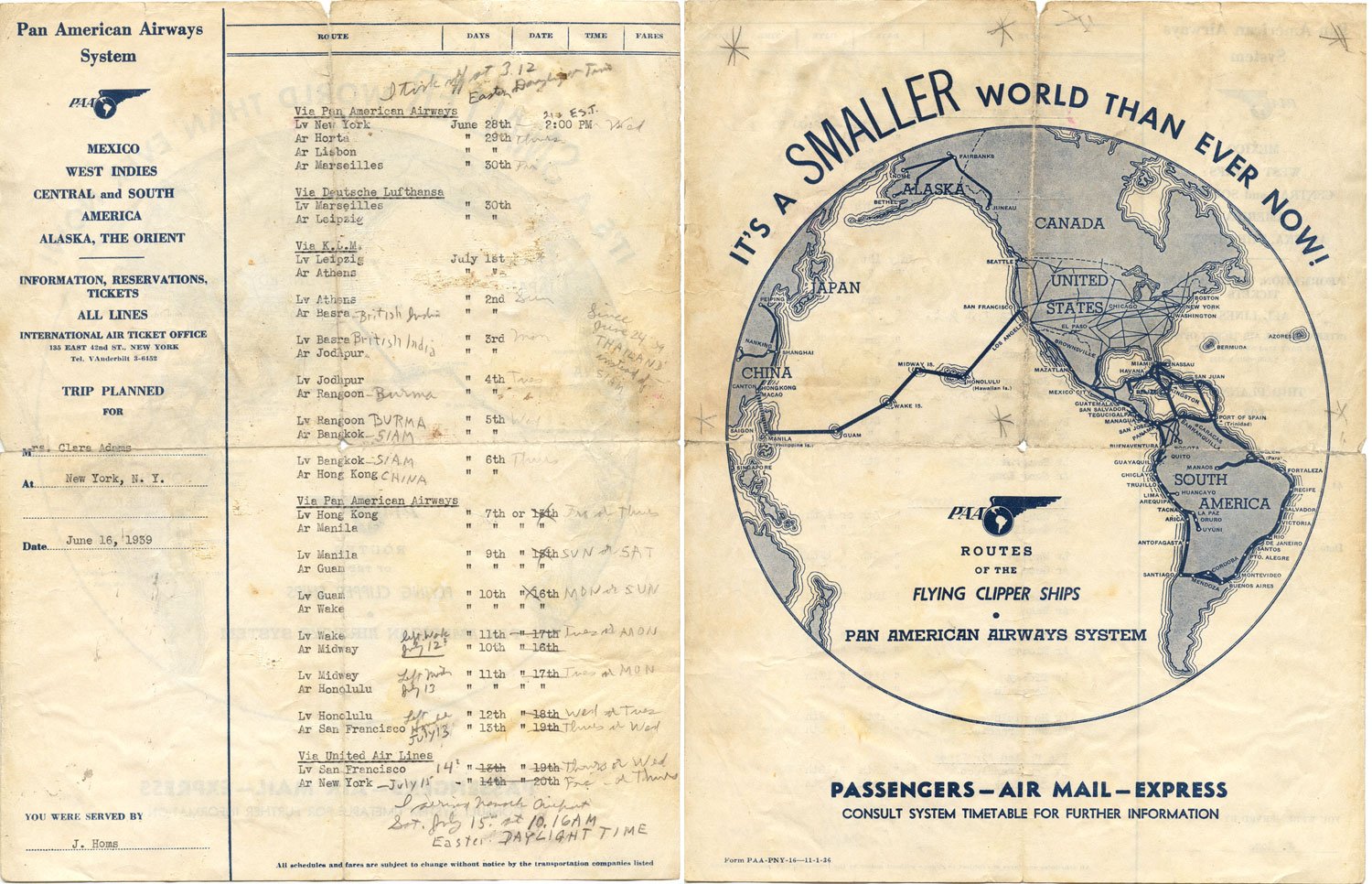 In 1939, she traveled from New York completely around the world on commercial airlines, Pan Am, Deutsche Lufthansa, KLM and United. The first legs were in Pan Am’s Dixie Clipper, the same Boeing 314 flying boat taking Franklin Delano Roosevelt to the Casablanca Conference in 1943. Clara’s easterly itinerary involved 16 stops, over a total of 16 days and 19 hours.