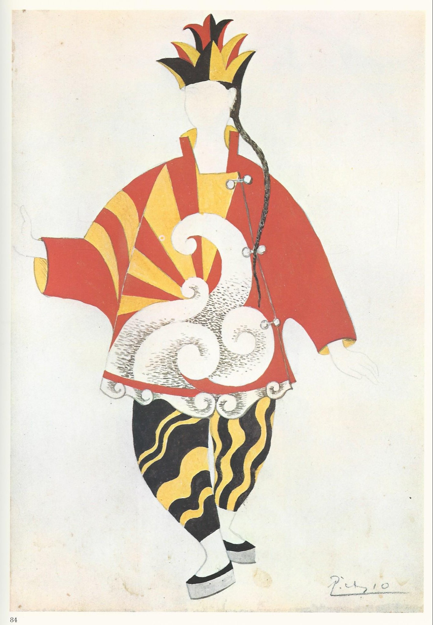 In approaching Pablo Picasso about designing Parade costumes and scenery, Cocteau sensed he had a hard sell. He wrote, “The idea of painting a décor, especially for the Russian Ballet… was no less than a crime. Worse still, we would have to join Serge de Diaghilew [sic] in Rome, and the Cubist code forbade any journey other than the one on the Nord-Sud from the Place des Abbesses to the Boulevard Raspial.” (This Paris Métro trip took all of 24 minutes.)