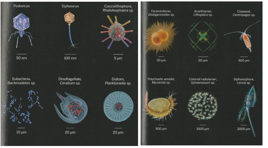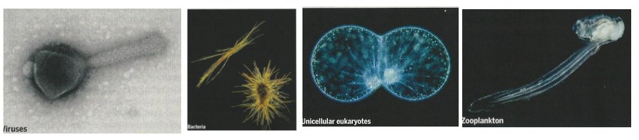A range of plankton, from left to right: Viruses, bacteria, unicellular eukaryotes and zooplankton.