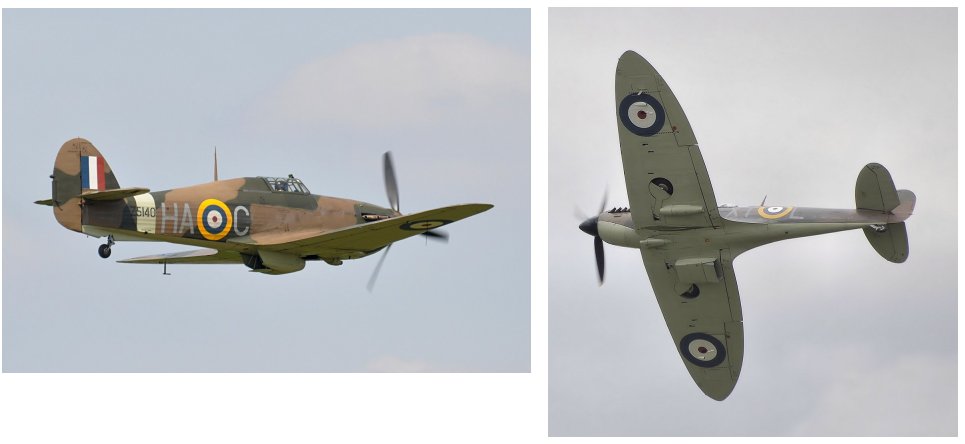 Above, left, Hawker Hurricane; right, Supermarine Spitfire. Below, Messerschmitt BF 109E with a Hurricane in the background, painting by Lou Drendel.
